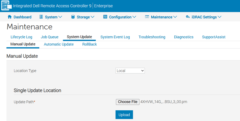 3. Load .pm file into idrac: Now that the .pm is extracted you need to login to idrac -> maintance -> system update -> choose file -> upload .pm